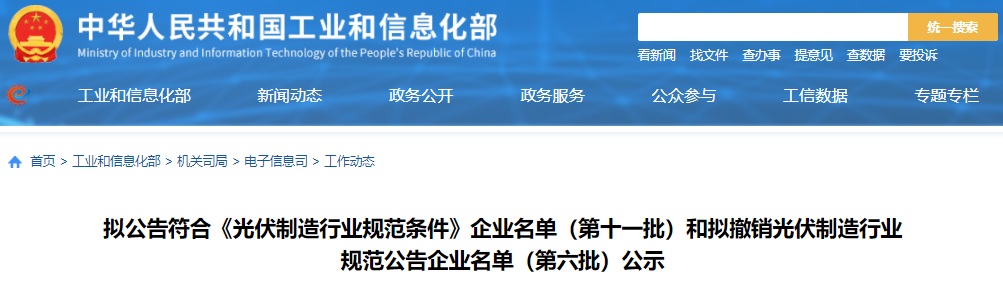 擬公告符合《光伏制造行業(yè)規(guī)范條件》企業(yè)名單(第十一批)和擬撤銷(xiāo)光伏制造行業(yè)規(guī)范公告企業(yè)名單(第六批)公示
