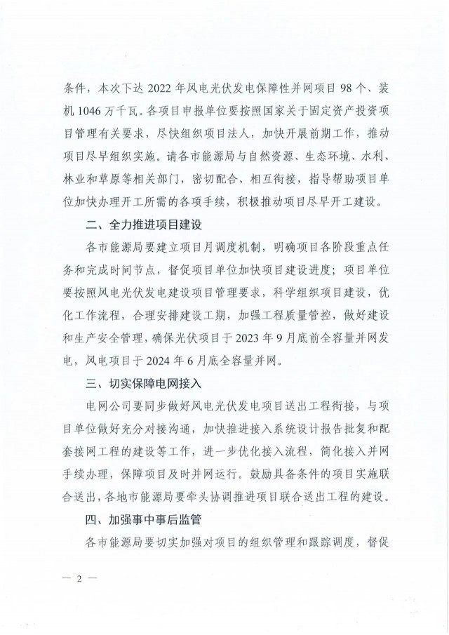 具體看,保障性并網(wǎng)項目98個,裝機(jī)1046萬千瓦(10.46GW)。其中,光伏項目68個,裝機(jī)741萬千瓦(7.41GW),風(fēng)光儲一體項目2個,裝機(jī)共25萬千瓦。要求確保光伏項目于2023年9月底前全容量并網(wǎng)發(fā)電。