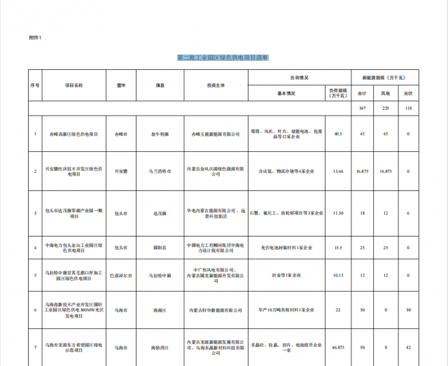 按照《內蒙古自治區(qū)工業(yè)園區(qū)綠色供電項目實施細則(2022年版)》要求,我局組織專家對各盟市申報的第二批工業(yè)園區(qū)綠色供電項目方案進行了評估,全區(qū)有13個項目納入自治區(qū)第二批工業(yè)園區(qū)綠色供電項目清單,共配建新能源規(guī)模347萬千瓦,其中風電229萬千瓦、光伏118萬千瓦。經報請自治區(qū)人民政府同意,現(xiàn)將第二批工業(yè)園區(qū)綠色供電項目清單(附件一)印發(fā)你們,并將有關要求通知如下。