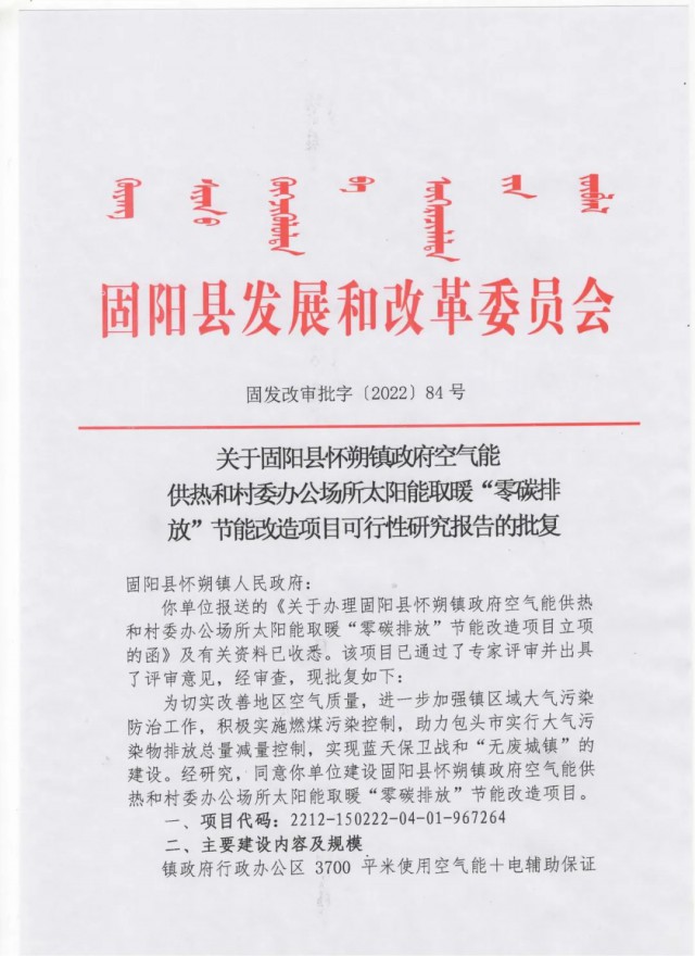 《固陽(yáng)縣懷朔鎮(zhèn)政府空氣能供熱和村委辦公場(chǎng)所太陽(yáng)能取暖"零碳排放”節(jié)能改造項(xiàng)目批復(fù)公示》