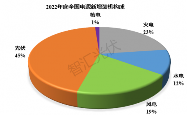 2022年,全國水電、火電、核電、風(fēng)電、光伏的裝機(jī)容量分別新增2387萬千瓦、4471萬千瓦、227萬千瓦、3763萬千瓦和8741萬千瓦,合計(jì)19974萬千瓦。2022年,各類電源新增裝機(jī)結(jié)構(gòu)如下圖所示。