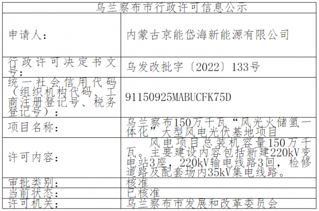 1、烏蘭察布岱海發(fā)電150萬千瓦風光火儲氫一體項目