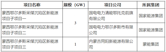 蒙西鄂爾多斯采煤沉陷區(qū)新能源項目共分三個子項目。其中,國家能源集團獲得兩個子項目,總規(guī)模為3GW,蒙能集團獲得一個子項目,規(guī)模為1GW。