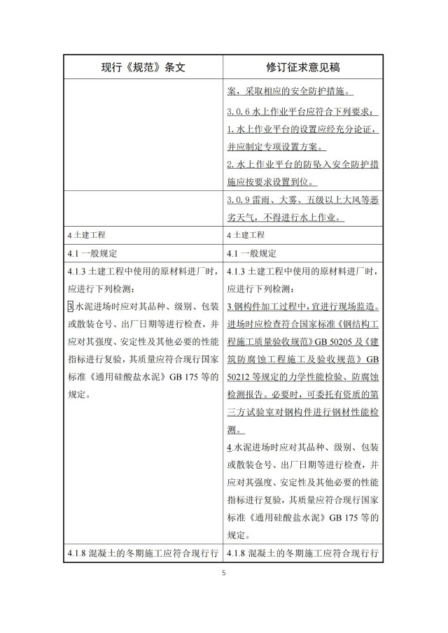 根據(jù)局部修訂條文對(duì)照表,新增水上光伏測(cè)繪、施工以及安全等一系列要求。例如,水上光伏發(fā)電站水下測(cè)繪工作應(yīng)完成,水下障礙物應(yīng)全部清理完畢。如施工場(chǎng)地有航道交叉,應(yīng)采取相應(yīng)安全保障措施。對(duì)于水面作業(yè)、作業(yè)面高度在2m及以上、作業(yè)面坡度大于30゜等特殊作業(yè)環(huán)境的項(xiàng)目,應(yīng)編制專項(xiàng)施工方案,采取相應(yīng)的安全防護(hù)措施。水上作業(yè)平臺(tái)應(yīng)符合下列要求:1.水上作業(yè)平臺(tái)的設(shè)置應(yīng)經(jīng)充分論證,并應(yīng)制定專項(xiàng)設(shè)置方案。2.水上作業(yè)平臺(tái)的防墜入安全防護(hù)措施應(yīng)按要求設(shè)置到位。