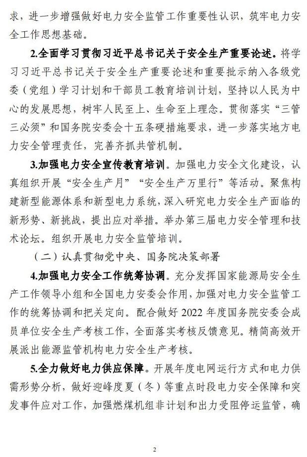 為貫徹落實黨的二十大精神,扎實做好2023年電力安全監(jiān)管工作,確保電力系統(tǒng)安全穩(wěn)定運行和電力可靠供應(yīng),推動全國電力安全生產(chǎn)形勢持續(xù)穩(wěn)定向好,我局制定了《2023年電力安全監(jiān)管重點任務(wù)》。現(xiàn)印發(fā)給你們,請結(jié)合本地區(qū)、本單位實際,認真貫徹落實。