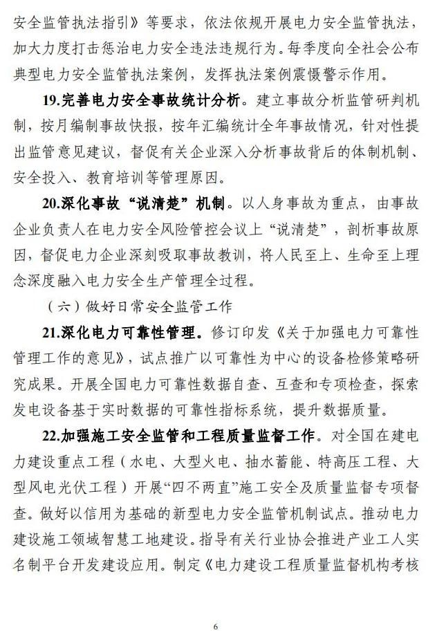 加強施工安全監(jiān)管和工程質(zhì)量監(jiān)督工作。對全國在建電力建設(shè)重點工程(水電、大型火電、抽水蓄能、特高壓工程、大型風(fēng)電光伏工程)開展“四不兩直”施工安全及質(zhì)量監(jiān)督專項督查。做好以信用為基礎(chǔ)的新型電力安全監(jiān)管機制試點。