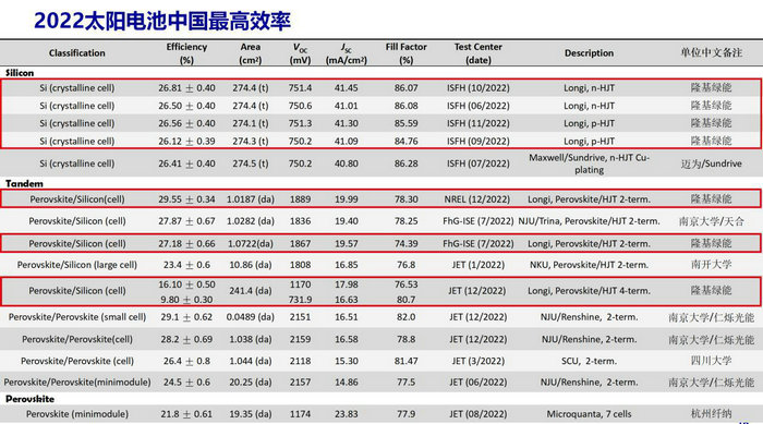 2022太陽電池中國最高效率發(fā)布,隆基綠能共有7個電池效率入選,占此次效率結果發(fā)布的近1/2。