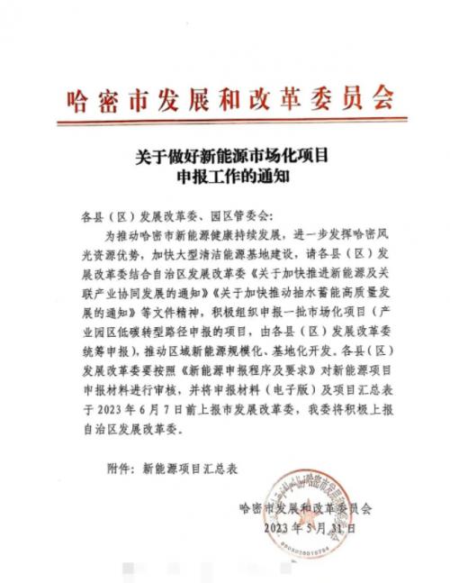 《通知》指出,為推動(dòng)哈密市新能源健康持續(xù)發(fā)展,進(jìn)一步發(fā)揮哈密風(fēng)光資源優(yōu)勢(shì),加快大型清潔能源基地建設(shè),請(qǐng)各縣(區(qū))發(fā)展改革委結(jié)合自治區(qū)發(fā)展改革委《關(guān)于加快推進(jìn)新能源及關(guān)聯(lián)產(chǎn)業(yè)協(xié)同發(fā)展的通知》《關(guān)于加快推動(dòng)抽水蓄能高質(zhì)量發(fā)展的通知》等文件精神,積極組織申報(bào)一批市場(chǎng)化項(xiàng)目(產(chǎn)業(yè)園區(qū)低碳轉(zhuǎn)型路徑申報(bào)的項(xiàng)目,由各縣(區(qū))發(fā)展改革委統(tǒng)籌申報(bào)),推動(dòng)區(qū)域新能源規(guī)模化、基地化開(kāi)發(fā)。