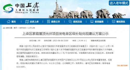 文件明確,根據(jù)《紹興市人民政府辦公室關(guān)于推進(jìn)紹興市家庭屋頂光伏工程建設(shè)的實(shí)施意見》(紹政辦發(fā)〔2017〕27號)和紹興市家庭屋頂光伏工程推進(jìn)工作領(lǐng)導(dǎo)小組辦公室《關(guān)于明確家庭屋頂光伏工程建設(shè)中有關(guān)事項的通知》文件精神,上虞區(qū)居民家庭屋頂光伏發(fā)電,按其實(shí)際發(fā)電量給予0.2元/千瓦時的補(bǔ)貼,補(bǔ)貼期限為自發(fā)電之日起五年。后續(xù)政策若有調(diào)整,按新政策實(shí)行。