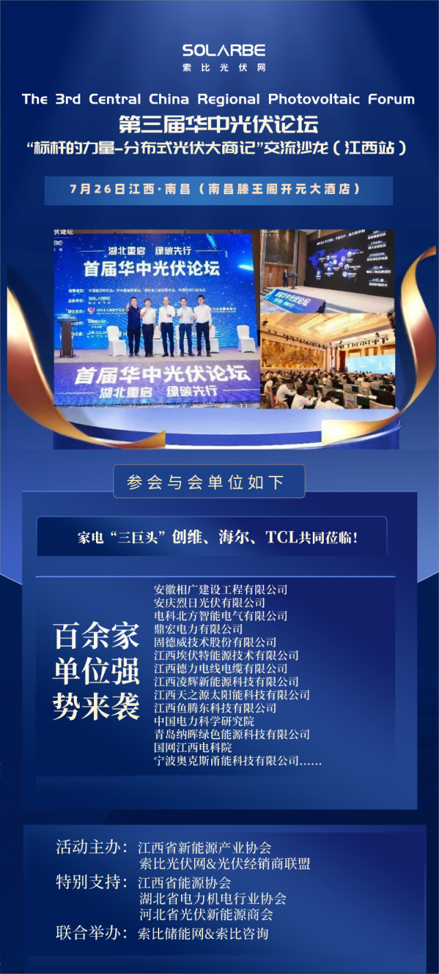 為了助力廣大光伏從業(yè)者進一步探索華中地區(qū)光伏市場發(fā)展?jié)摿?,有的放矢,索比光伏網(wǎng)定于2023年7月26日在江西南昌舉辦第三屆華中光伏論壇暨“標桿的力量--分布式光伏大商記”-江西站,誠邀各位光伏同仁蒞臨交流!