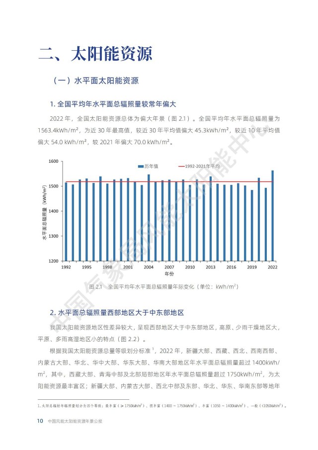 根據(jù)中國(guó)氣象局公布的《2022年中國(guó)風(fēng)能太陽(yáng)能資源年景公報(bào)》,太陽(yáng)能資源每年都會(huì)發(fā)生變化。其中,2022年為太陽(yáng)能資源大年,全國(guó)平均的年水平面總輻射量比近30年平均值高出約3%。因此,2022年的光伏發(fā)電量應(yīng)該普遍偏好!