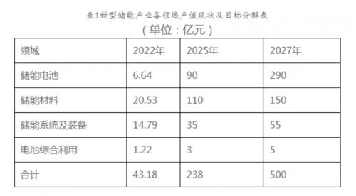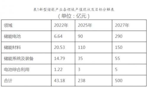 文件明確,到2027年,新型儲(chǔ)能產(chǎn)業(yè)產(chǎn)值規(guī)模超500億元,儲(chǔ)能電池產(chǎn)能達(dá)40GWh,新型儲(chǔ)能電站裝機(jī)規(guī)模達(dá)260萬千瓦以上。力爭培育產(chǎn)值超過100億元企業(yè)1家以上,超50億元企業(yè)5家以上,超10億元企業(yè)10家以上。