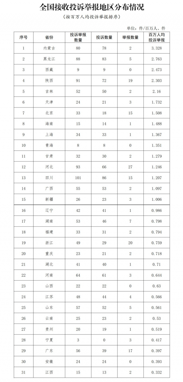 各省(自治區(qū)、直轄市)按照接收投訴舉報數(shù)量排序,四川、河北、陜西、黑龍江、內(nèi)蒙古排在全國前5位。其中:按投訴數(shù)量排序,四川、黑龍江、內(nèi)蒙古、陜西、河北排在全國前5位;按舉報數(shù)量排序,河北、浙江、陜西、廣東、北京(四川并列)排在全國前5位;按百萬人均投訴舉報數(shù)量排序,內(nèi)蒙古、黑龍江、西藏、陜西、吉林排在全國前5位。(全國接收投訴舉報地區(qū)分布情況詳見附件1)