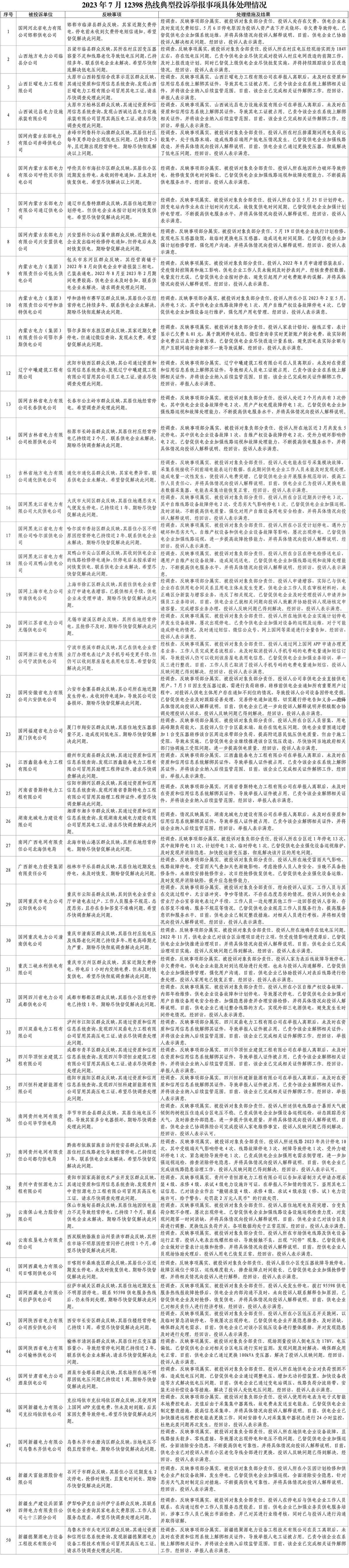 2023年7月,國家能源局12398能源監(jiān)管熱線(以下簡稱12398熱線)共接收投訴舉報1316件,辦結(jié)投訴舉報821件(含往期結(jié)轉(zhuǎn))?,F(xiàn)將有關(guān)情況通報如下: