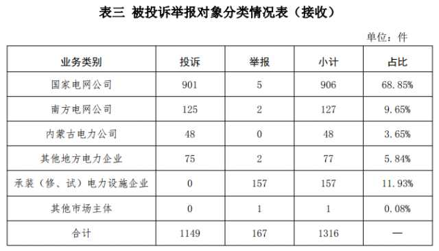 供電企業(yè)1158件、占投訴舉報總數(shù)的87.99%,其中國家電網(wǎng)公司906件、占投訴舉報總數(shù)的68.85%,南方電網(wǎng)公司127件、占投訴舉報總數(shù)的9.65%,內(nèi)蒙古電力公司48件、占投訴舉報總數(shù)的3.65%,其他地方電力企業(yè)77件、占投訴舉報總數(shù)的5.84%;承裝(修、試)電力設(shè)施企業(yè)157件、占投訴舉報總數(shù)的11.93%;其他市場主體1件、占投訴舉報總數(shù)的0.08%。