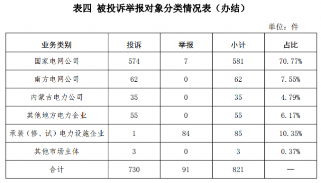 從被投訴舉報對象看,供電企業(yè)733件、占投訴舉報總數(shù)的89.28%,其中國家電網(wǎng)公司581件、占比70.77%,南方電網(wǎng)公司62件、占比7.55%,內(nèi)蒙古電力公司35件、占比3.65%,其他地方電力企業(yè)55件、占比6.17%;承裝(修、試)電力設(shè)施企業(yè)85件、占比10.35%;其他市場主體3件、占比0.37%。
