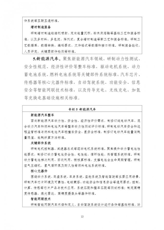 《方案》明確,在新能源汽車方面,聚焦新能源汽車領域,研制動力性測試、安全性規(guī)范、經濟性評價等整車標準,驅動電機系統(tǒng)、動力蓄電池系統(tǒng)、燃料電池系統(tǒng)等關鍵部件系統(tǒng)標準,汽車芯片、傳感器等核心元器件標準,自動駕駛系統(tǒng)、功能安全、信息安全等智能網聯技術標準,以及傳導充電、無線充電、加氫等充換電基礎設施相關標準。