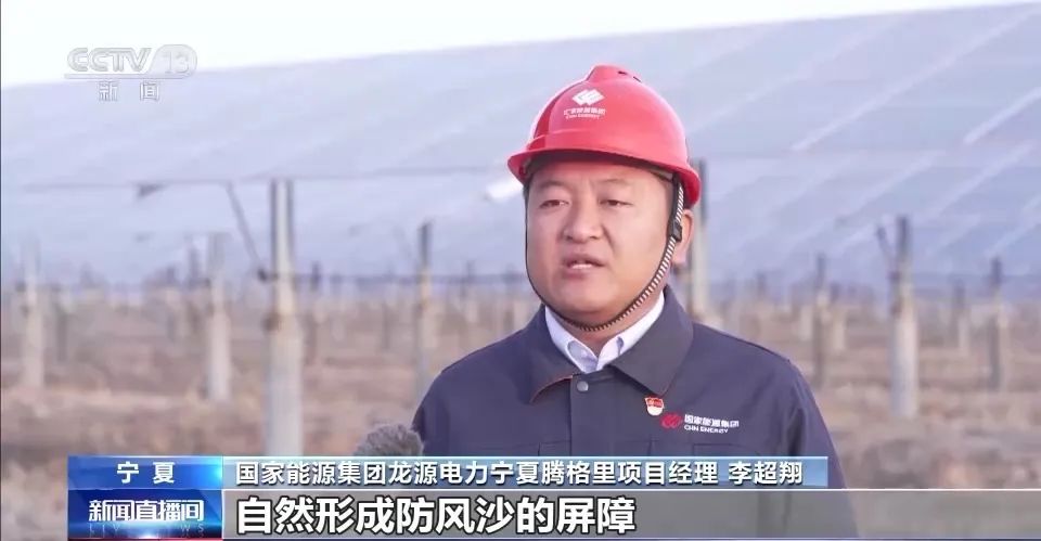 國家能源集團(tuán)龍源電力寧夏騰格里項目經(jīng)理 李超翔:我們通過建設(shè)光伏陣列自然形成防風(fēng)沙的屏障,并采用在地表扎草方格,實(shí)現(xiàn)防沙、固沙、治沙。在一期光伏項目2.8萬畝占地面積中,治沙范圍已超過2.6萬畝。
