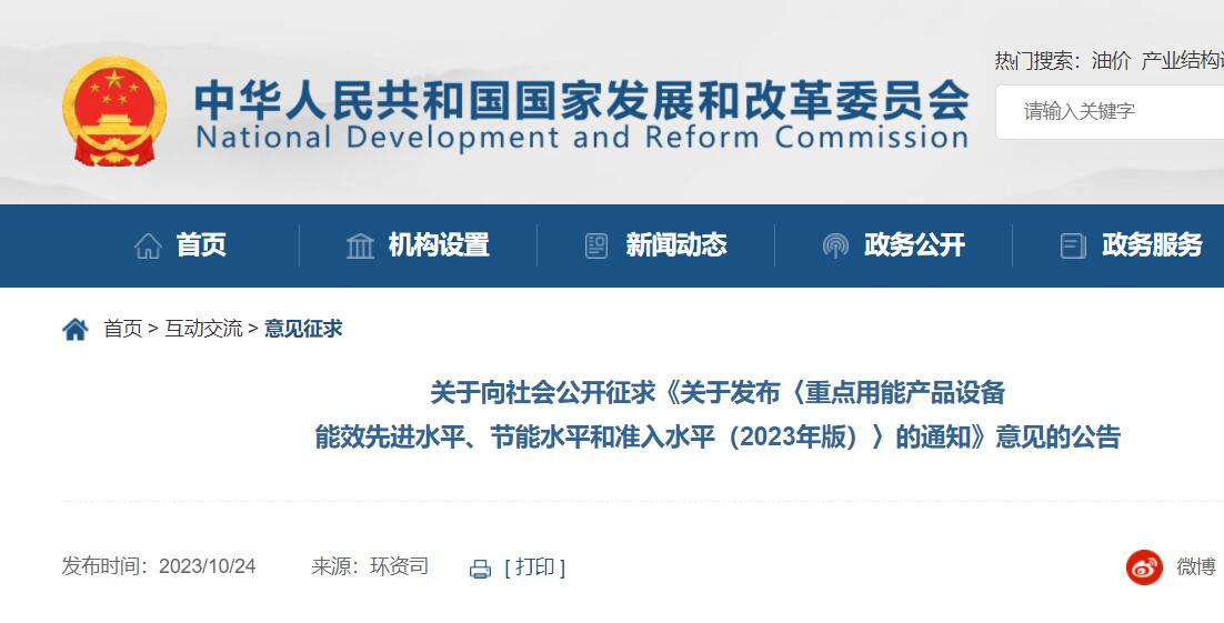 10月24日,國(guó)家發(fā)改委發(fā)布公告,就《關(guān)于發(fā)布〈重點(diǎn)用能產(chǎn)品設(shè)備能效先進(jìn)水平、節(jié)能水平和準(zhǔn)入水平(2023年版)〉的通知(征求意見(jiàn)稿)》公開(kāi)征求意見(jiàn)。