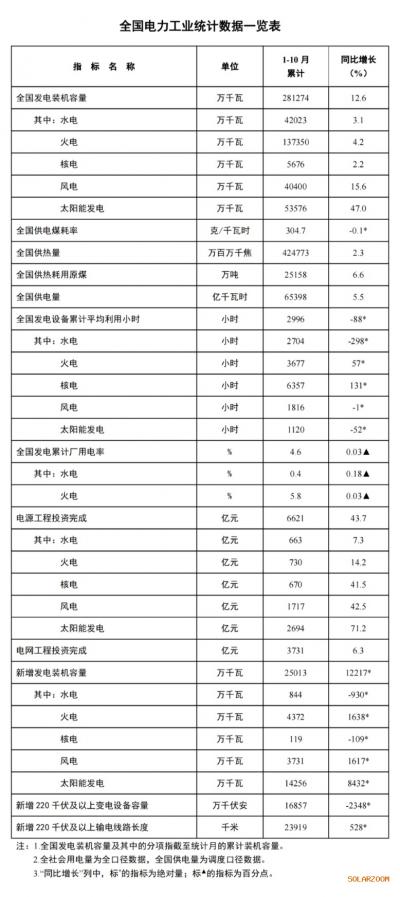 截至10月底,全國累計發(fā)電裝機容量約28.1億千瓦,同比增長12.6%。其中,太陽能發(fā)電裝機容量約5.4億千瓦,同比增長47.0%;風電裝機容量約4.0億千瓦,同比增長15.6%。