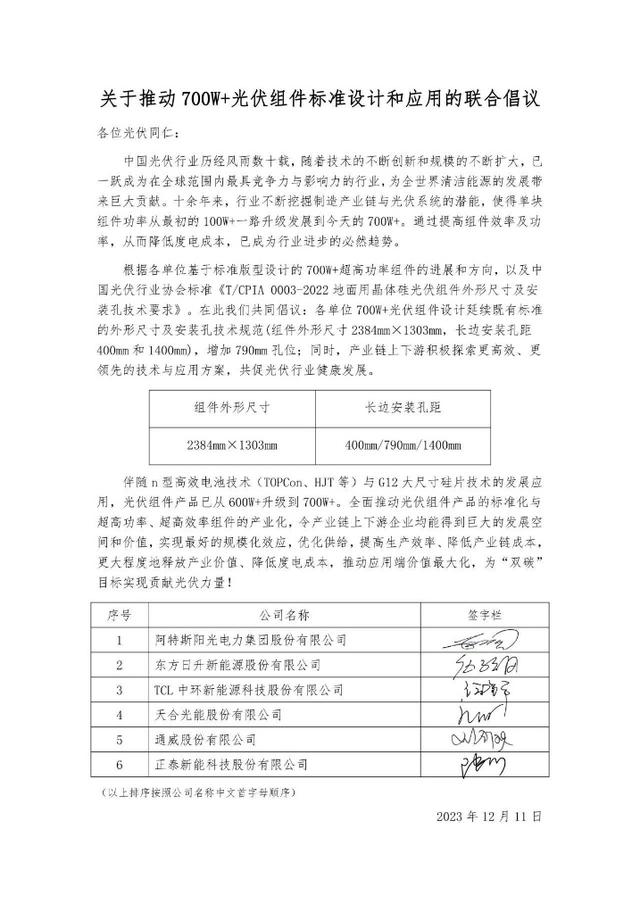 12月11日阿特斯陽光電力集團(tuán)、東方日升、TCL中環(huán)、天合光能、通威股份、正泰新能等公司發(fā)布聯(lián)合倡議,推動(dòng)700W+光伏組件標(biāo)準(zhǔn)設(shè)計(jì)和應(yīng)用。倡議提出,各單位700W+光伏組件設(shè)計(jì)延續(xù)既有標(biāo)準(zhǔn)的外形尺寸及安裝孔技術(shù)規(guī)范(組件外形尺寸2384mm×1303mm,長邊安裝孔距400mm和1400mm),增加790mm孔位;同時(shí),產(chǎn)業(yè)鏈上下游積極探索更高效、更領(lǐng)先的技術(shù)與應(yīng)用方案,共促光伏行業(yè)健康發(fā)展。