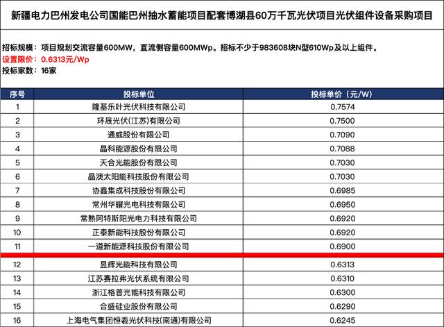 記者了解到,上述采購(gòu)項(xiàng)目的投標(biāo)企業(yè)共有16家,11家企業(yè)報(bào)出了高于或與0.69元/W持平的價(jià)格。其中,隆基綠能旗下的隆基樂葉給出了0.7574元/W的最高報(bào)價(jià),一道新能的報(bào)價(jià)為0.69元/W,與協(xié)會(huì)最近一次發(fā)布的組件成本價(jià)一致。