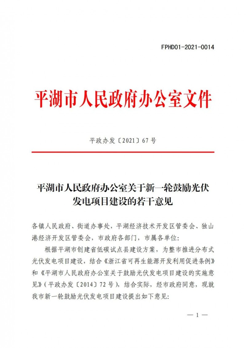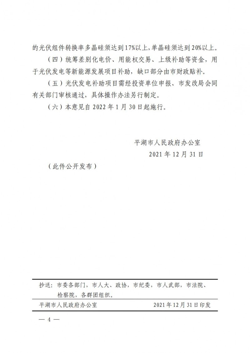 1月11日,平湖市人民政府發(fā)布了關(guān)于新一輪鼓勵光伏發(fā)電項(xiàng)目建設(shè)的若干意見。明確到“十四五”末,平湖市光伏發(fā)電裝機(jī)容量達(dá)到600兆瓦以上,實(shí)際新增200兆瓦以上,年平均新增裝機(jī)容量在40兆瓦以上。
