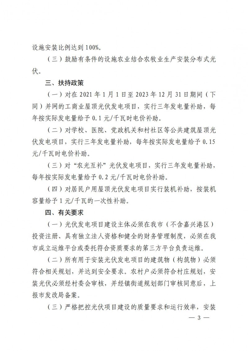 同時繼續(xù)對利用農(nóng)村獨(dú)立住宅屋頂或庭院、新農(nóng)村集中連片住房、城鎮(zhèn)高(多)層住宅小區(qū)、公寓、保障性住房、別墅排屋等民居建筑屋頂和農(nóng)村村級組織集體屋頂、城鎮(zhèn)社區(qū)公共建筑屋頂?shù)募彝ノ蓓敼夥?xiàng)目實(shí)施補(bǔ)貼,市級財(cái)政對2021年至2025年期間并網(wǎng)的家庭屋頂光伏項(xiàng)目按0.45元/千瓦時標(biāo)準(zhǔn)給予補(bǔ)貼,補(bǔ)貼時限為并網(wǎng)發(fā)電之后第二個完整抄表月起12個月。
