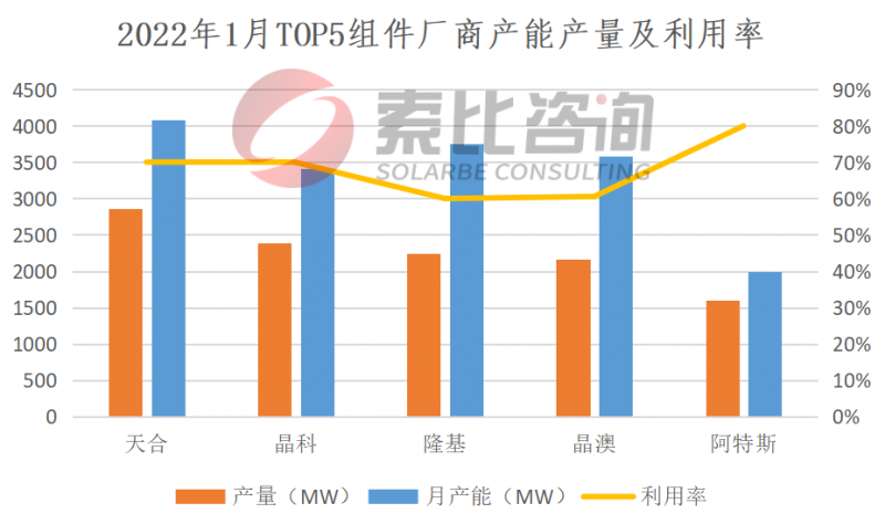 2022年1月,終端需求大幅上升,國(guó)內(nèi)組件產(chǎn)量19.73GW,環(huán)比大增23.31%。按照產(chǎn)量排名,天合、晶科、隆基、晶澳、阿特斯位列前五,企業(yè)總產(chǎn)量11.27GW,占比57.12%,綜合開(kāi)工率68.11%。預(yù)計(jì)2022年2月,海外需求還會(huì)有所提升,組件產(chǎn)量預(yù)計(jì)持平或小幅上漲。