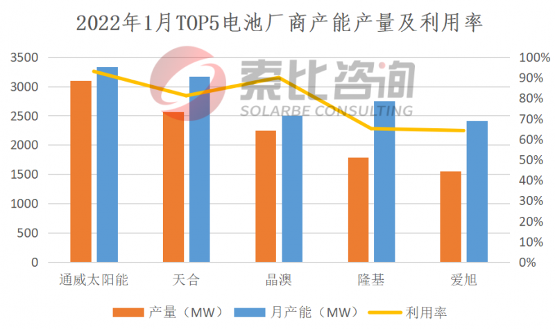 2022年1月,電池企業(yè)產(chǎn)量20.86GW,環(huán)比大增16.99%。按照產(chǎn)量排名,通威、天合、晶澳、隆基、愛(ài)旭位列前五,企業(yè)總產(chǎn)量11.26GW,占比53.98%,綜合利用率78.68%。垂直一體化企業(yè)綜合利用率率79.48%,主流電池企業(yè)綜合利用率76.59%。