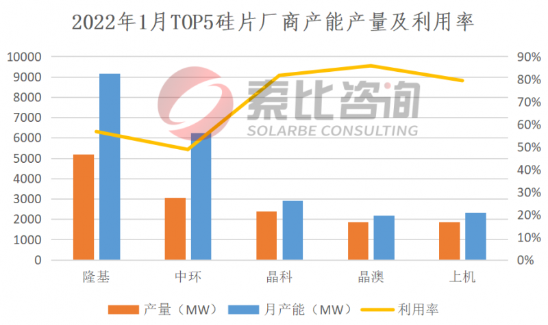 2022年1月,國(guó)內(nèi)12家多晶硅企業(yè)在產(chǎn),大全和永祥新增產(chǎn)能陸續(xù)釋放,產(chǎn)量再創(chuàng)新高。1月份國(guó)內(nèi)多晶硅產(chǎn)量為5.2萬(wàn)噸(約20.54GW),環(huán)比增長(zhǎng)6.56%。按照產(chǎn)量排名,永祥、協(xié)鑫、大全、新特、東方希望位列前五,企業(yè)總產(chǎn)量4.51萬(wàn)噸,占比86.7%,綜合利用率90.6%。索比咨詢預(yù)期2月份硅料產(chǎn)量繼續(xù)小幅上漲。從供應(yīng)端來(lái)看,1月份新特、大全、永祥、協(xié)鑫擴(kuò)產(chǎn)增量繼續(xù)釋放。從需求端來(lái)看,國(guó)內(nèi)和海外市場(chǎng)一季度終端需求受訂單延期和免稅期截止等因素影響,相較往年將有一定程度增長(zhǎng);此外,硅片企業(yè)迅速提升開(kāi)工率,硅料需求短期內(nèi)大幅增加。