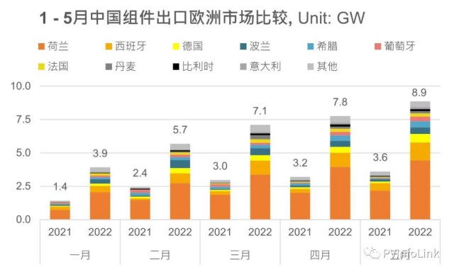目前中國(guó)主要出口成長(zhǎng)的區(qū)域市場(chǎng),仍是目前能源轉(zhuǎn)型最積極,同時(shí)也因俄羅斯和烏克蘭沖突下能源供應(yīng)不穩(wěn)定而面臨能源危機(jī)的歐洲。歐洲五月從中國(guó)進(jìn)口了8.9GW的光伏組件,同比成長(zhǎng)146%,1 – 5月則是累計(jì)了33.3GW,同比成長(zhǎng)144%,為各區(qū)域市場(chǎng)中成長(zhǎng)最高。2021年歐洲全年進(jìn)口量已經(jīng)是最高的40.9GW,占中國(guó)2021年出口的46%,在基期已高且今年仍呈現(xiàn)逐月成長(zhǎng)的態(tài)勢(shì)下,印證了歐洲市場(chǎng)對(duì)于光伏產(chǎn)品的需求仍然強(qiáng)勁。