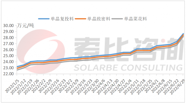 回顧2022年上半年,硅料價(jià)格整體呈現(xiàn)單邊上漲趨勢(shì),單晶復(fù)投料、單晶致密料、單晶菜花料均價(jià)漲幅分別為23.14%、23.24%、23.61%。