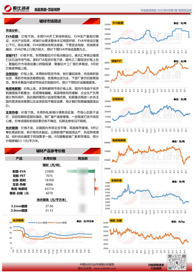 光伏產(chǎn)業(yè)周監(jiān)測(cè)報(bào)告系索比咨詢對(duì)于光伏產(chǎn)業(yè)鏈上下游價(jià)格的監(jiān)測(cè)與預(yù)報(bào),幫助企業(yè)獲得最實(shí)時(shí)的參考價(jià)格。每周除了對(duì)硅料、硅片、電池片、組件、輔材等價(jià)格進(jìn)行追蹤和分析外,亦關(guān)注下游招標(biāo)動(dòng)態(tài),并對(duì)后續(xù)市場(chǎng)趨勢(shì)做出研判。