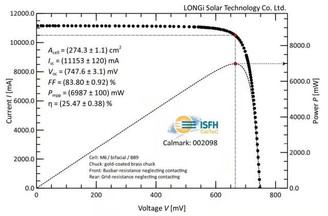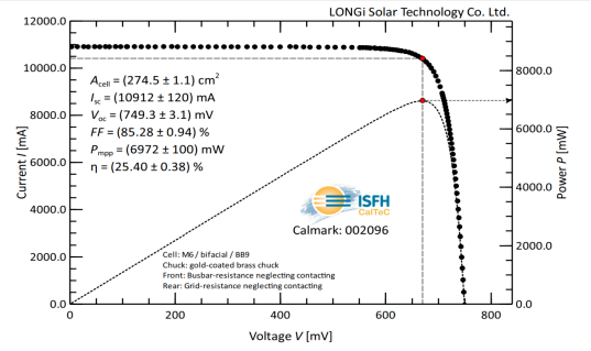 3月31日,繼3月29日宣布p-HJT 以25.47%打破世紀(jì)紀(jì)錄后,經(jīng)德國(guó)哈梅林太陽能研究所(ISFH)認(rèn)證,隆基研發(fā)團(tuán)隊(duì)在M6全尺寸(274.5cm2)單晶硅片上創(chuàng)造了無銦HJT電池25.40%轉(zhuǎn)換效率的新世界紀(jì)錄,持續(xù)夯實(shí)HJT電池低成本技術(shù)路線的產(chǎn)業(yè)化基礎(chǔ)。