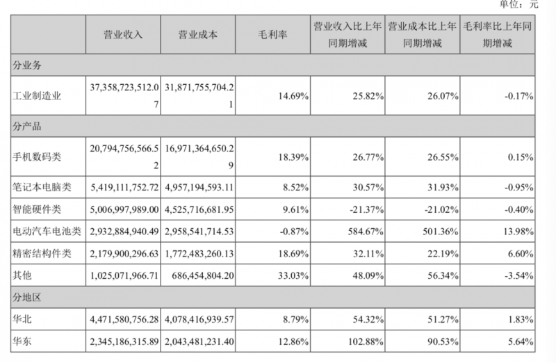 具體到欣旺達(dá)旗下各大業(yè)務(wù)分類,欣旺達(dá)的業(yè)務(wù)主要是消費(fèi)電子類業(yè)務(wù)(包括手機(jī)數(shù)碼類、筆記本電腦類和智能硬件類)和汽車及動力電池類業(yè)務(wù)組成。而目前欣旺達(dá)的總體收入主要來源依然是消費(fèi)電子業(yè)務(wù),2021年實(shí)現(xiàn)營業(yè)收入312.16億元,同比增長16%,占比達(dá)到83.57%,其中手機(jī)數(shù)碼類的毛利率維持在18.39%,近3年變化不大。
