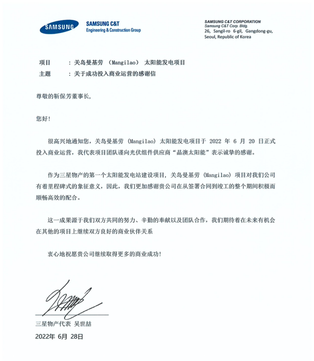 為表示對晶澳在項目建設(shè)過程中的大力支持以及對晶澳高品質(zhì)產(chǎn)品的贊賞和感謝,三星物產(chǎn)在項目建成后特寄來感謝信,以表謝意。三星物產(chǎn)在感謝信中寫道:“作為三星物產(chǎn)的第一個太陽能發(fā)電站建設(shè)項目,關(guān)島曼基勞項目對我們公司有著里程碑式的象征意義,因此,我們更加感謝貴公司在從簽署合同到竣工的整個期間積極而順暢高效的配合?!?/p>