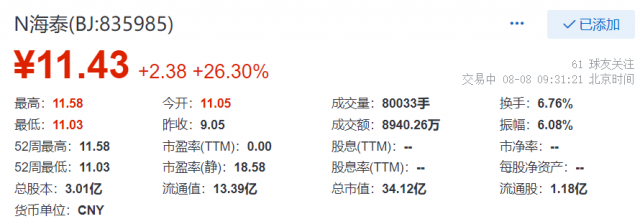 8月8日,唐山海泰新能科技股份有限公司(證券簡稱:“海泰新能”,證券代碼:“835985”)正式敲鐘,登陸北京證券交易所,發(fā)行價9.05元。截至發(fā)稿,其股價達到11.43元,漲幅為26.30%,總市值超34億元。
