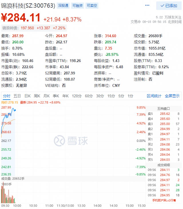 8月18日早盤,錦浪科技(SZ:300763)股價大漲8.37%,報284.11元/股,總市值首次突破千億大關(guān)!