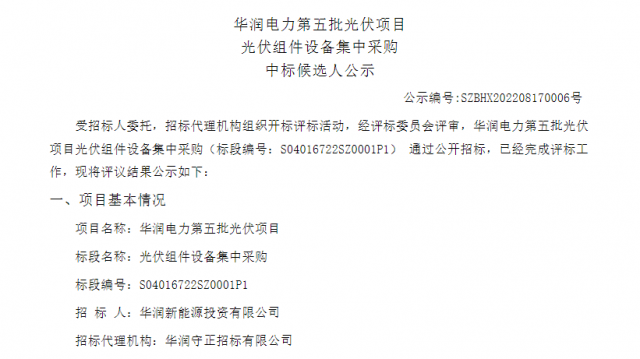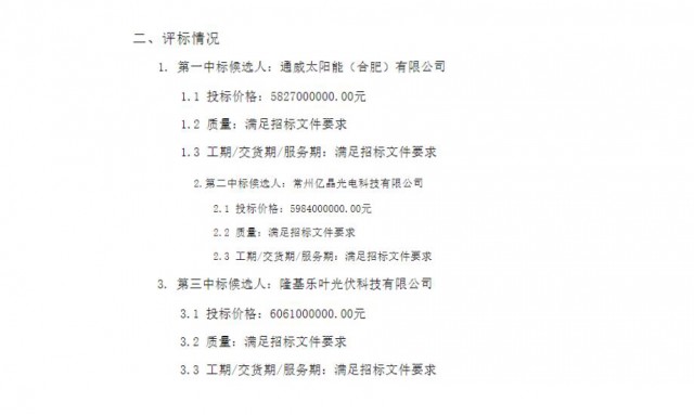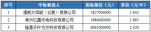 8月17日,華潤電力第五批光伏項目光伏組件設(shè)備集中采購中標(biāo)候選人公示。通威太陽能、億晶光電、隆基樂葉3家企業(yè)分列前三中標(biāo)候選人,具體如下表所示。