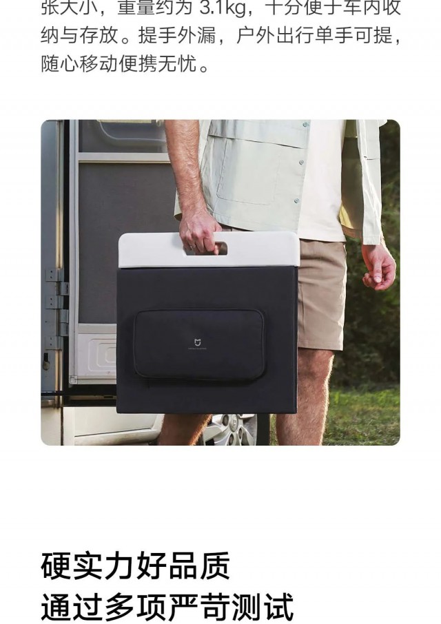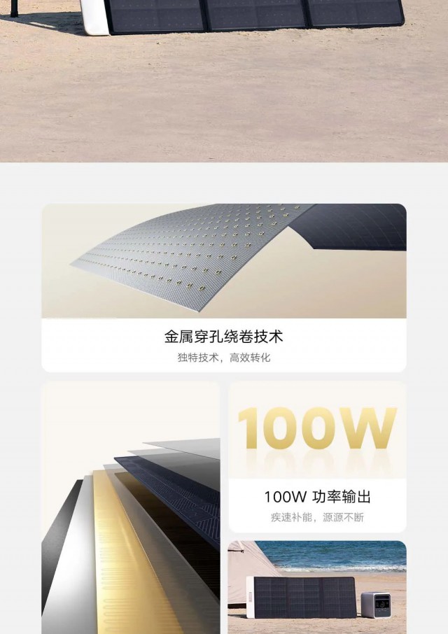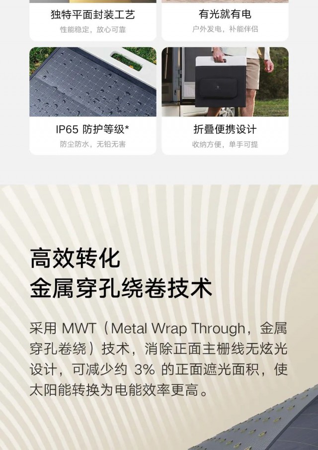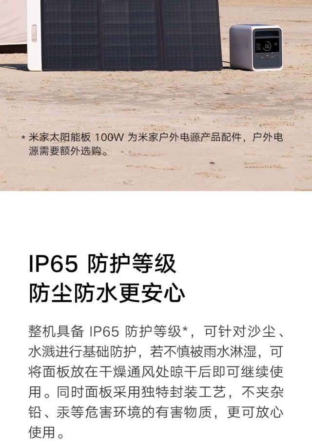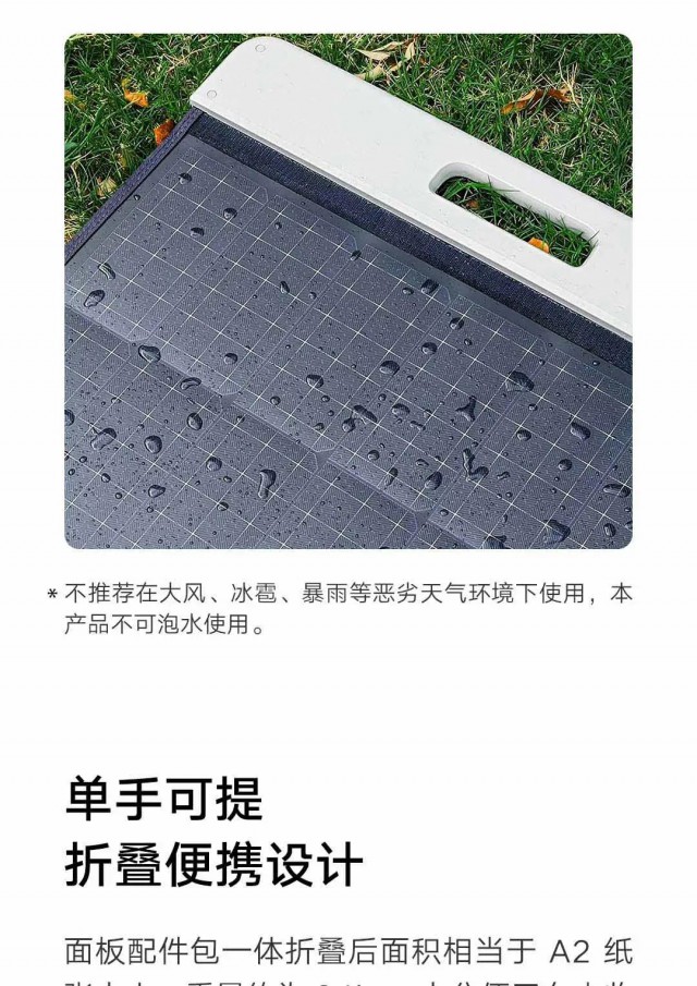此外,米家太陽(yáng)能板100W整機(jī)具備IP65防護(hù)等級(jí),可針對(duì)沙塵、水濺等進(jìn)行基礎(chǔ)防護(hù)。面板配件包一體折疊后面積相當(dāng)于A2紙張大小,重量約為3.1kg,十分便于車(chē)內(nèi)收納與存放。提手外漏設(shè)計(jì),戶(hù)外出行單手可提,隨心移動(dòng)便攜無(wú)憂(yōu)。