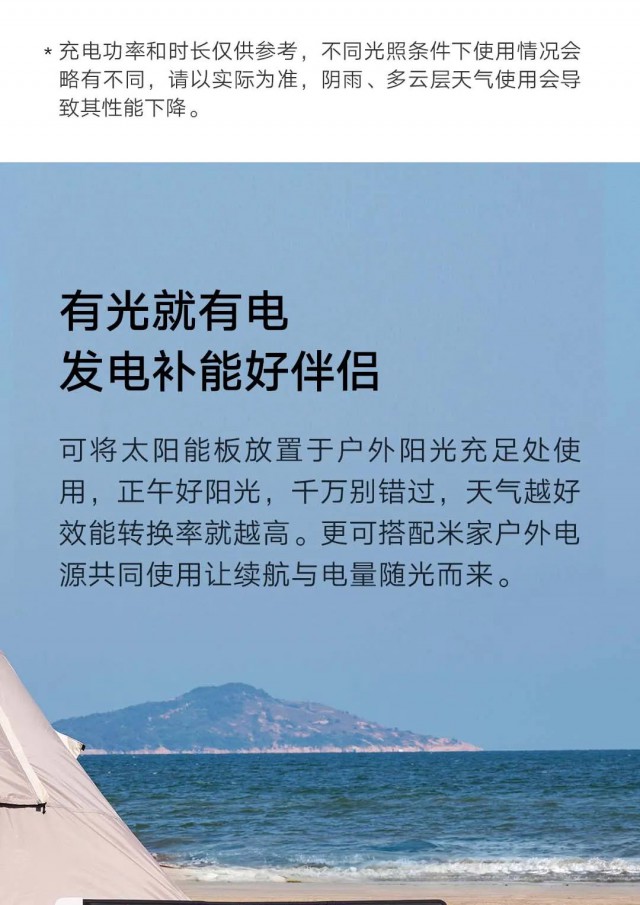 米家太陽(yáng)能板100W擁有最高100W MAX大功率,可搭配戶(hù)外電源進(jìn)行快速補(bǔ)能,同時(shí)支持邊曬邊充,戶(hù)外有光就有電。