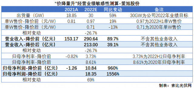 首先來看愛旭股份,假設(shè)2022年電池片單W售價(jià)下降至2020年的水平,同時(shí)盈利能力恢復(fù)至同期水平,按照全年出貨30GW計(jì)算,則營(yíng)收規(guī)模相比于降價(jià)前下降27%,營(yíng)收增速由89.7%下降至39.1%。不過,受益于盈利能力的修復(fù),經(jīng)營(yíng)業(yè)績(jī)暴增1556%,相較于降價(jià)前的960%大幅提升。