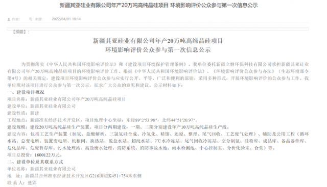 根據(jù)該項(xiàng)目此前公示的第一次環(huán)評(píng)顯示,項(xiàng)目建設(shè)單位為其亞鋁業(yè)集團(tuán)子公司新疆其亞鋁電有限公司。工程位于新疆準(zhǔn)東經(jīng)濟(jì)技術(shù)開發(fā)區(qū)。建設(shè)規(guī)模為20萬(wàn)噸高純晶硅生產(chǎn)裝置。項(xiàng)目分兩期建設(shè),一期、二期分別建設(shè)年產(chǎn)10萬(wàn)噸高純晶硅生產(chǎn)線。