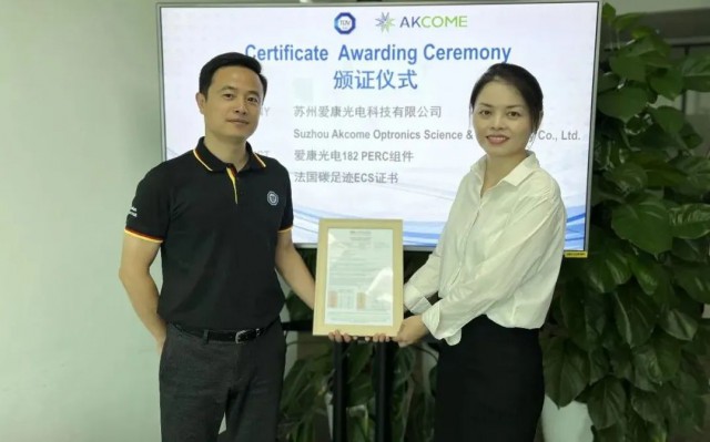 近日,TüV南德意志集團(tuán)(以下簡(jiǎn)稱“TüV南德”)順利為蘇州愛康光電科技有限公司(以下簡(jiǎn)稱“愛康光電”)完成182 PERC系列組件產(chǎn)品法國(guó)碳足跡ECS證書的交付,助力愛康光電的全球化戰(zhàn)略布局。