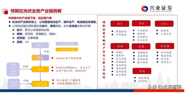 據(jù)興業(yè)證券特斯拉光伏業(yè)務(wù)產(chǎn)業(yè)鏈拆解圖可以看出,特斯拉的組件幾乎全都依靠著國(guó)內(nèi)廠商。