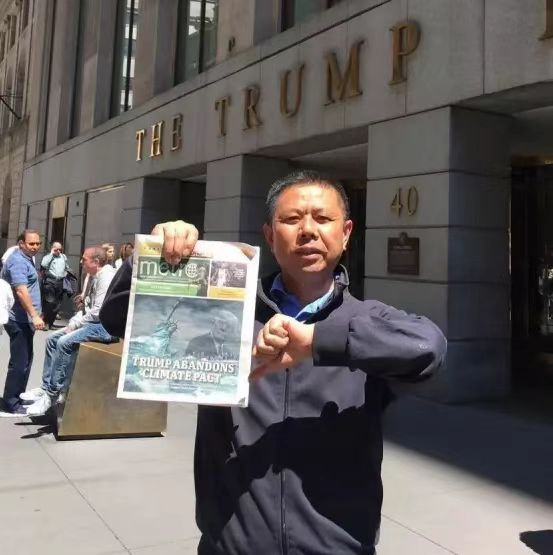 2017年,在特朗普宣布退出巴黎氣候協(xié)定的第二天,憤怒的高紀凡便一個人跑到紐約特朗普大廈門前,右手拿著剛剛印出來的報紙,左手大拇指朝下,抗議的同時還不忘招賢納士:歡迎全球致力于低碳技術(shù)創(chuàng)新的人到中國發(fā)展。