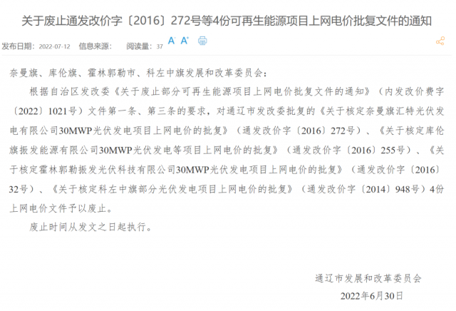 此前,太極實業(yè)(600667)8月4日晚間公告,公司關(guān)注到內(nèi)蒙古發(fā)改委官網(wǎng)刊登的《關(guān)于廢止部分可再生能源項目上網(wǎng)電價批復文件的通知》,涉及子公司五個集中式光伏電站;所涉電站將不再享受電費補貼,公司將對所涉電站評估后計提固定資產(chǎn)減值準備,初步測算固定資產(chǎn)減值金額為3.28億元左右。該項固定資產(chǎn)減值預(yù)計將減少公司2022年上半年凈利潤3.28億元左右,占最近一期經(jīng)審計凈利潤的36.12%。同時,本次電價批復廢止將導致所涉電站電價補貼被取消,經(jīng)初步測算,預(yù)計減少公司2022年下半年光伏發(fā)電業(yè)務(wù)收入4906萬元左右,減少公司2022年下半年凈利潤4170萬元左右。