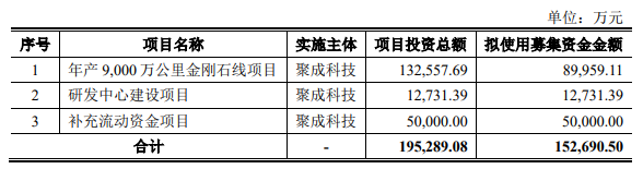 據悉,本次聚成科技擬募資15.27億元,其中約9億元擬用于年產9000萬公里金剛石線項目、1.27億元用于研發(fā)中心建設項目、5億元用于補充流動資金項目。