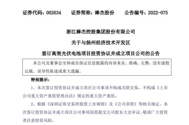 棒杰股份表示結(jié)合自身戰(zhàn)略轉(zhuǎn)型優(yōu)勢(shì)及我國(guó)光伏產(chǎn)業(yè)快速發(fā)展的機(jī)遇,依托戰(zhàn)略股東 光伏領(lǐng)域的豐富經(jīng)驗(yàn)和揚(yáng)州經(jīng)濟(jì)技術(shù)開發(fā)區(qū)管委會(huì)體制創(chuàng)新、發(fā)展活力及產(chǎn)業(yè)政 策支持,投資建設(shè)10GW高效光伏電池片生產(chǎn)基地,實(shí)現(xiàn)公司主營(yíng)業(yè)務(wù)向光伏業(yè)的戰(zhàn)略轉(zhuǎn)型升級(jí),形成新的利潤(rùn)增長(zhǎng)點(diǎn),為公司業(yè)務(wù)發(fā)展提供有力支持,是公司實(shí)施戰(zhàn)略發(fā)展的重要舉措,對(duì)公司未來發(fā)展具有積極意義和推動(dòng)作用。